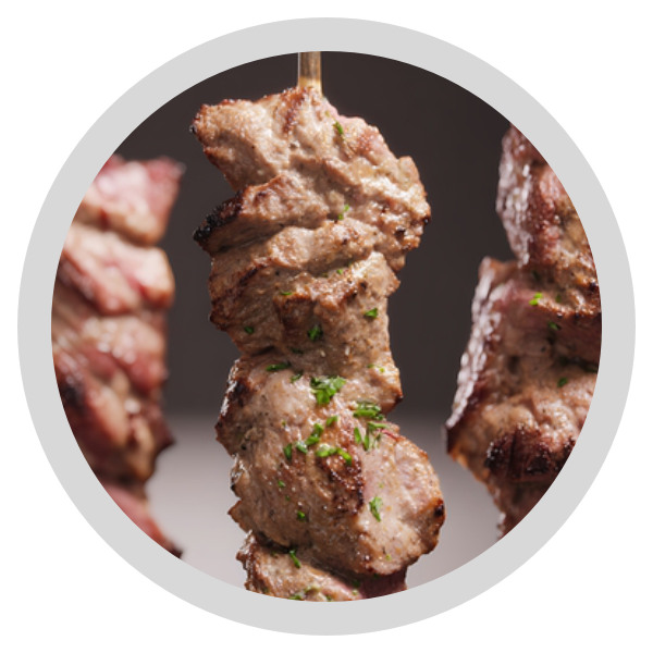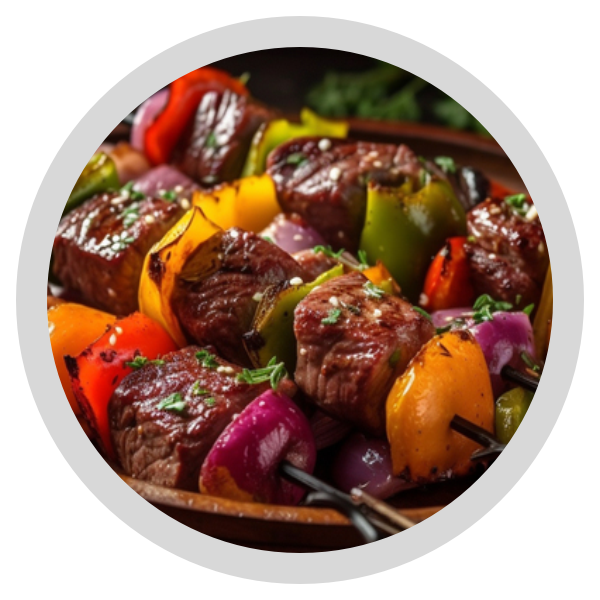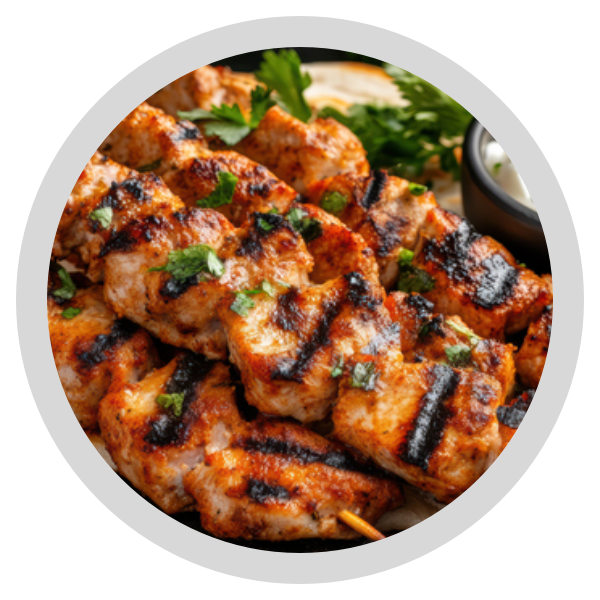 Charcoal grilled boneless Chicken & filet mignon cubes.