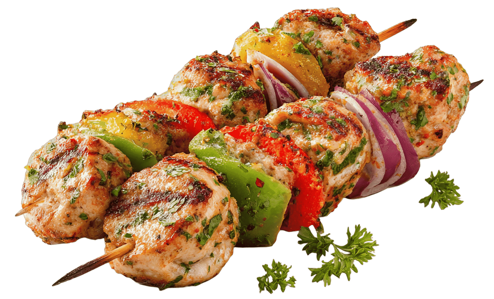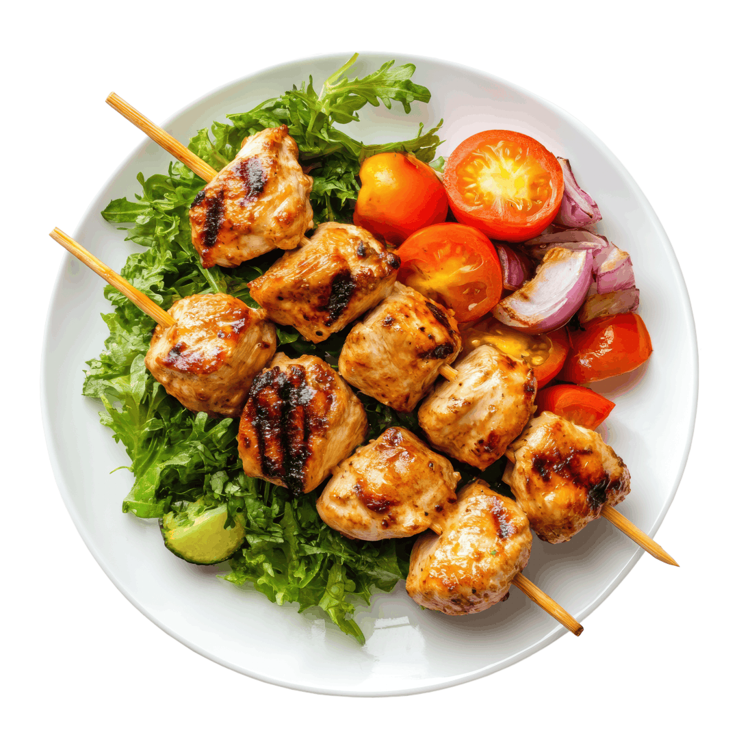 Charcoal grilled boneless Chicken & filet mignon cubes.